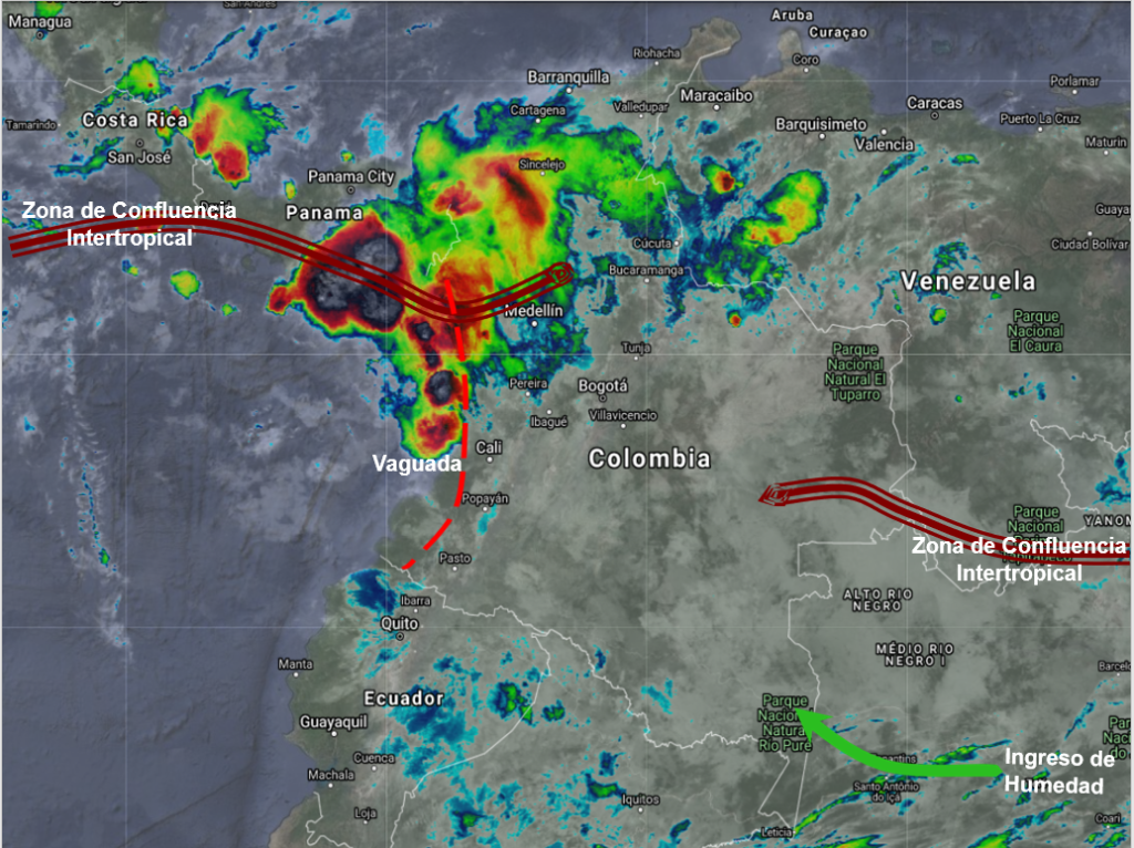 La interacción del ramal Pacífico de la Zona de Confluencia Intertropical con una Vaguada, así como el ingreso de humedad desde el suroriente, favorece condiciones inestables en algunas partes del país, generando lluvias moderadas, algunas acompañadas de actividad eléctrica, en sectores de los departamentos de Córdoba, Chocó, Antioquia, Valle, Cauca, Nariño, Arauca y Vichada, especialmente en horas de la tarde. Precipitaciones ocasionales y lluvias sectorizadas en Santander, Cundinamarca, Boyacá, Meta, Casanare, Guainía, Huila, Caquetá y Putumayo.
