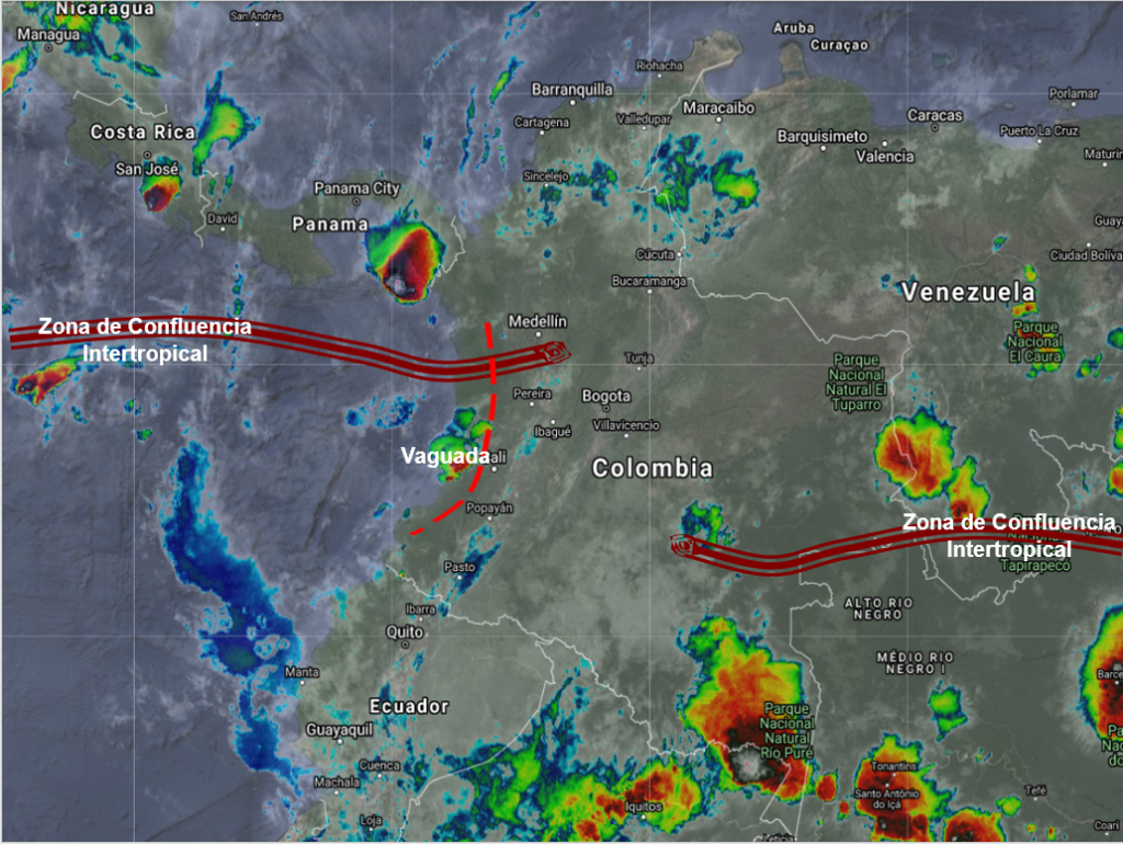 El ramal Pacífico de la Zona de Confluencia Intertropical en interacción con una Vaguada, genera condiciones inestables afectando parte de las regiones Pacífica, Andina y sur de la región Caribe. Se prevén lluvias moderadas a fuertes y algunas tormentas en sectores de los departamentos de Chocó y Antioquia. Lluvias ligeras en el Eje Cafetero, Córdoba, Sucre, Bolívar, Cesar, Magdalena, Norte de Santander, Santander, Nariño, Caquetá, Putumayo y Guaviare. El ingreso de humedad por el oriente del país favorece la presencia de lluvias de variada intensidad y tormentas en Guainía, Vaupés y Amazonas.