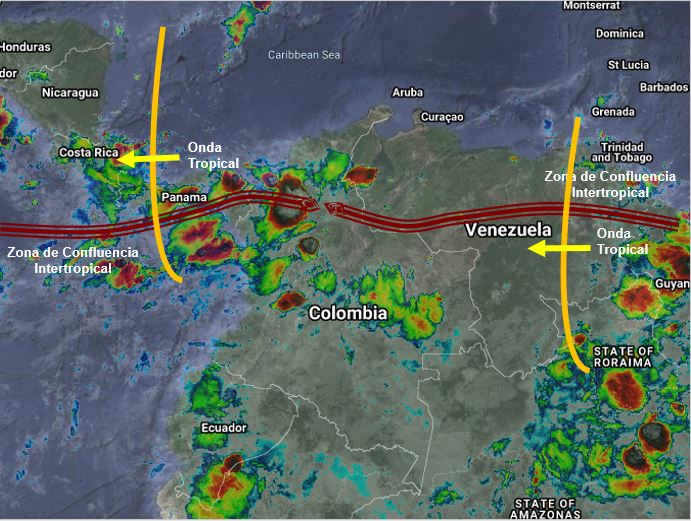 La Zona de Confluencia Intertropical y el paso de Ondas Tropicales del Este, generan nubosidad convectiva y lluvias de variada intensidad, algunas acompañadas de actividad eléctrica en los departamentos Cesar, Magdalena, Atlántico, Bolívar, Sucre, Córdoba, Antioquia, Eje Cafetero, Chocó, Valle del Cauca, Norte de Santander, Santander y Boyacá. Precipitaciones ocasionales y lluvias de menor intensidad en Cauca, Nariño, Cundinamarca, Meta, Casanare, Arauca y Vichada.