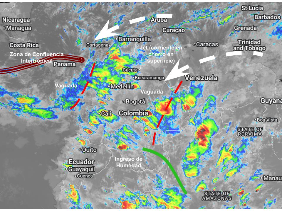 El ramal Pacífico de la Zona de Confluencia Intertropical en interacción con una Vaguada, un Sistema de Baja Presión, así como procesos convectivos locales favorecen condiciones inestables, que generan lluvias ligeras a moderadas y algunas tormentas en sectores de los departamentos de Amazonas, Antioquia, Atlántico, Bolívar, Boyacá, Caldas, Caquetá, Cauca, Cesar, Chocó, Córdoba, Cundinamarca, Guainía, Guaviare, Huila, Magdalena, Meta, Nariño, Norte de Santander, Putumayo, Quindío, Risaralda, Santander, Sucre, Tolima, Valle del Cauca, Vaupés y Vichada Precipitaciones ocasionales y lluvias de menor intensidad en los departamentos de la Guajira, Arauca y Casanare.