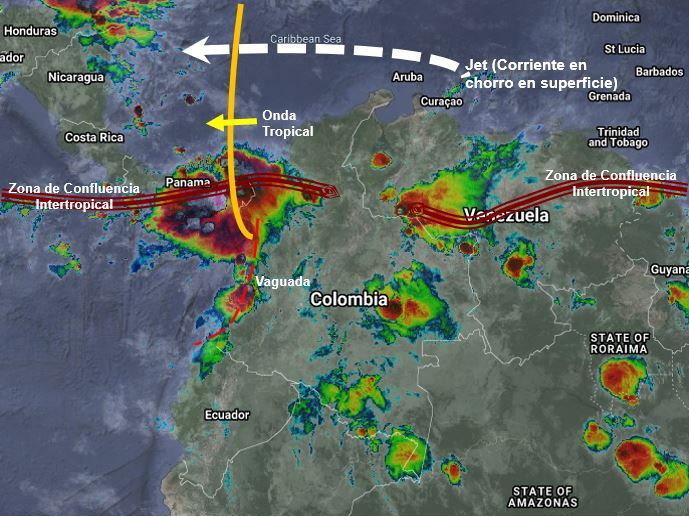 El ramal pacifico de la Zona de Confluencia Intertropical en interacción con una vaguada, el paso de Ondas Tropicales del Este y procesos convectivos locales, generan nubosidad con probabilidad de lluvias ligeras a moderadas en sectores de los departamentos de Cesar, Magdalena, Bolívar, Sucre, Córdoba, Antioquia, Eje Cafetero, Chocó, Valle del Cauca, Cauca, Nariño, Putumayo, Caquetá, Tolima, Meta, Cundinamarca, Boyacá, Santander, Arauca, Vichada y Amazonas. Precipitaciones ocasionales y lluvias de menor intensidad en Norte de Santander, Casanare, Guainía, Guaviare, Vaupés, y Huila.