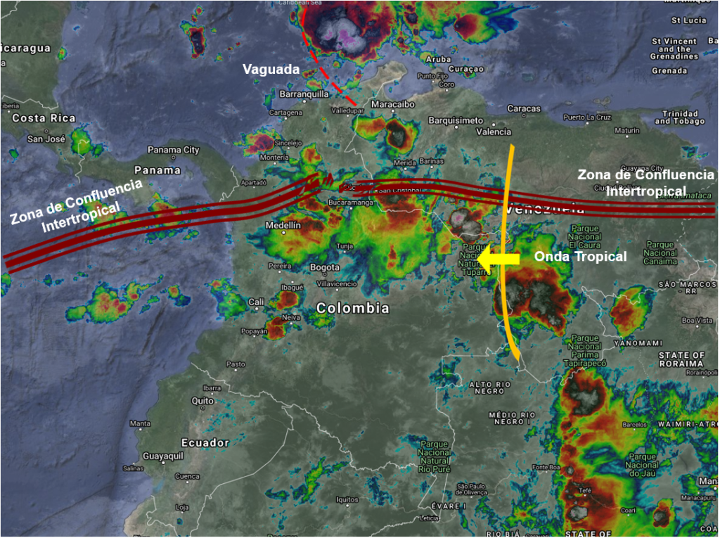 El ingreso de una Onda Tropical por el oriente del país, así como una Vaguada en Niveles Bajos, genera condiciones inestables en gran parte del territorio. Lluvias fuertes y tormentas a lo largo de la región Andina, en la región Caribe y en el centro y norte de la región Pacifica, especialmente en sectores de los departamentos Chocó, Antioquia, Risaralda, Caldas, Quindío, Tolima, Cundinamarca, Boyacá, Santander, Arauca, Casanare, Norte de Santander, Cesar, La Guajira, Magdalena, Atlántico, Bolívar, Sucre y Córdoba. Lluvias ligeras a moderadas con algunas tormentas aisladas en el Valle de Cauca, Cauca, Nariño, Amazonas, Caquetá, Vaupés, Guainía y Vichada.
