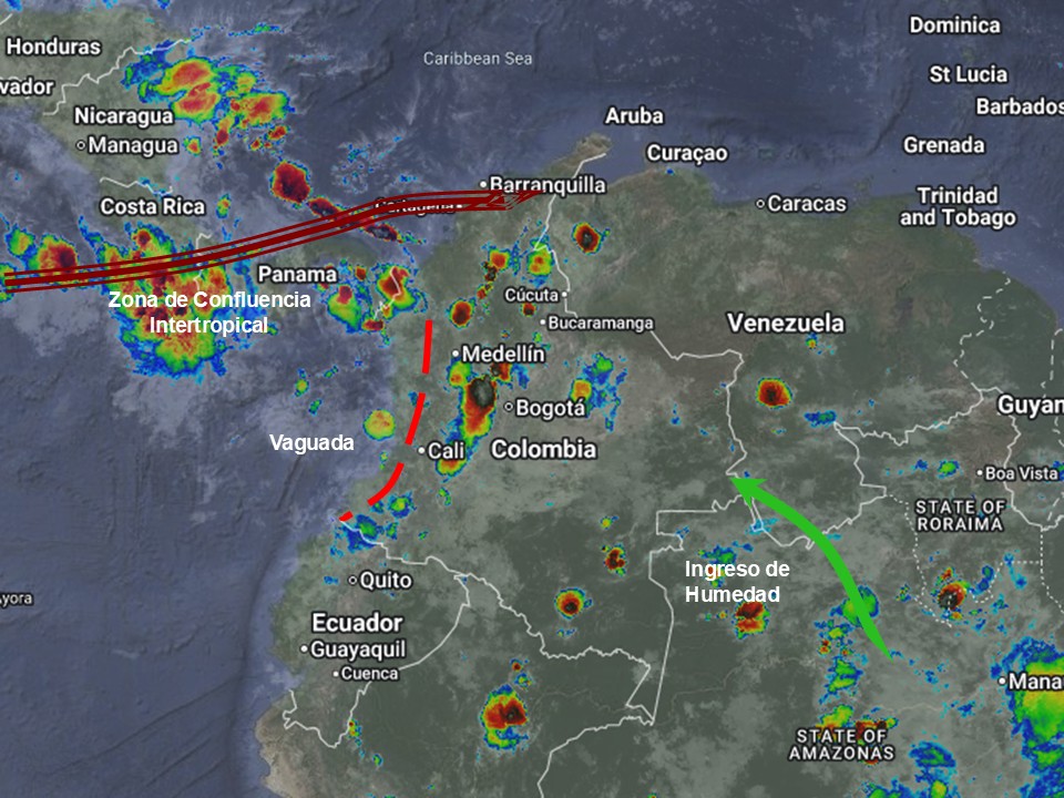 El ramal Pacífico de la Zona de Confluencia Intertropical en interacción con una Vaguada, un Sistema de Baja Presión, así como procesos convectivos locales favorecen condiciones inestables, que generan lluvias ligeras a moderadas y algunas tormentas en sectores de los departamentos de Córdoba, Antioquia, Chocó, Valle del Cauca, Cauca, Nariño, Putumayo, Caquetá, Meta, Casanare, Arauca, Vichada, Guainía, Guaviare, Vaupés y Amazonas. Precipitaciones ocasionales y lluvias de menor intensidad en los departamentos de Atlántico, Magdalena, Bolívar, Sucre, Cesar, Los Santanderes, Boyacá, Cundinamarca, Tolima y Huila.