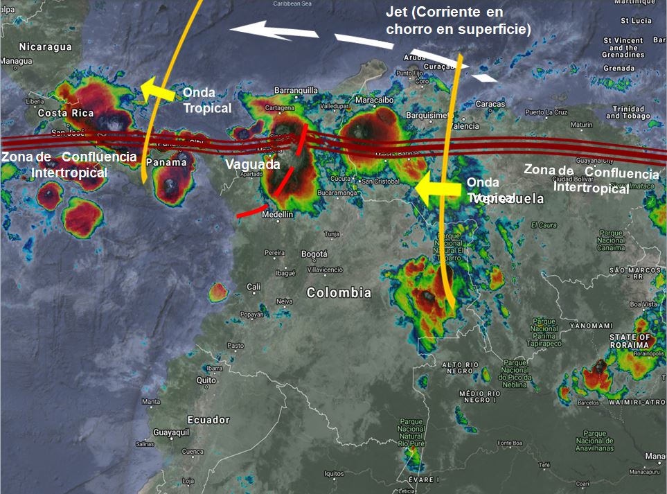 El paso de Ondas Tropicales del Este y su interacción con la Zona de Confluencia Intertropical y una vaguada, continúan generando inestabilidad atmosférica en el oriente, centro, norte y occidente del país. especialmente en las regiones Caribe, Pacifica, Andina y Orinoquia.