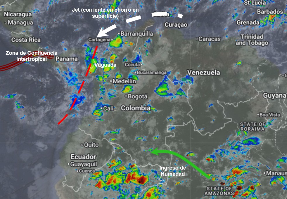 El ramal Pacífico de la Zona de Confluencia Intertropical en interacción con una Vaguada, un Sistema de Baja Presión, así como procesos convectivos locales favorecen condiciones inestables, que generan lluvias ligeras a moderadas y algunas tormentas en sectores de los departamentos de Amazonas, Antioquia, Atlántico, Bolívar, Boyacá, Caldas, Caquetá, Cauca, Cesar, Chocó, Córdoba, Cundinamarca, La Guajira, Guainía, Guaviare, Huila, Magdalena, Meta, Nariño, Norte de Santander, Putumayo, Quindío, Risaralda, Santander, Sucre, Tolima, Valle del Cauca, Vaupés y Vichada. Precipitaciones ocasionales y lluvias de menor intensidad en los departamentos de la Norte de Santander, Arauca y Casanare.