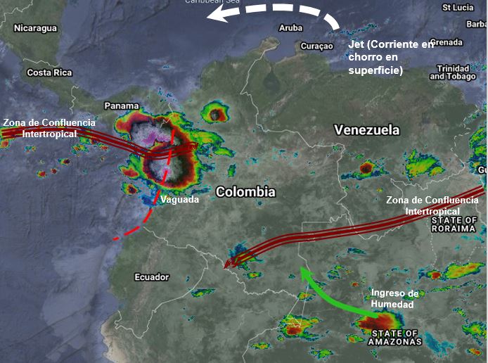 La interacción del ramal Pacífico de la Zona de Confluencia Intertropical con una Vaguada, así como el ingreso de humedad desde el suroriente y procesos convectivos locales favorecen condiciones inestables en algunos sectores del país, generando lluvias ligeras a moderadas, algunas acompañadas de actividad eléctrica en los departamentos de Córdoba, Chocó, Antioquia, Santander, Boyacá, Cundinamarca, Eje Cafetero, Valle del Cauca, Cauca, Nariño, Putumayo, Caquetá, Amazonas, Vaupés, Guainía y Vichada. Precipitaciones ocasionales y lluvias sectorizadas en Bolívar, Cesar, Meta, Tolima, Huila y Guaviare.