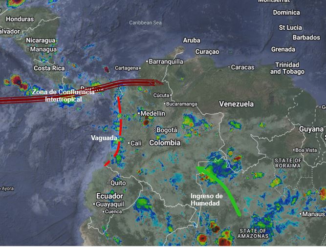 El ramal Pacífico de la Zona de Confluencia Intertropical en interacción con una Vaguada, un Sistema de Baja Presión, así como procesos convectivos locales favorecen condiciones inestables, que generan lluvias ligeras a moderadas y algunas tormentas en sectores de los departamentos de Cesar, Magdalena, Bolívar, Sucre, Córdoba, Antioquia, Santanderes, Boyacá, Cundinamarca, Eje Cafetero, Chocó, Valle del Cauca, Cauca, Nariño, Meta, Casanare, Arauca, Vichada, Guainía, Guaviare, Vaupés y Amazonas. Precipitaciones ocasionales y lluvias de menor intensidad en los departamentos de Guajira, Atlántico, Tolima, Huila, Putumayo y Caquetá.