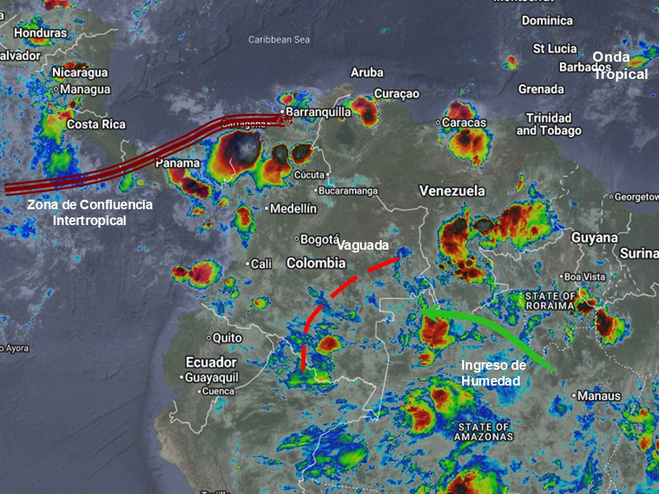 El ramal Pacífico de la Zona de Confluencia Intertropical en interacción con una Vaguada, el ingreso de humedad por el Oriente del país, así como procesos convectivos locales favorecen condiciones inestables, que generan lluvias ligeras a moderadas y algunas tormentas en sectores de los departamentos de la Guajira, Atlántico, Magdalena, Cesar, Sucre, Córdoba, Bolívar, Los Santanderes, Antioquia, Chocó, Valle del Cauca, Cauca, Nariño, Boyacá, Cundinamarca, Meta, Vichada, Guaviare y Vaupés. Precipitaciones ocasionales y lluvias de menor intensidad en los departamentos de Tolima, Huila, Caquetá, Putumayo, Arauca, Casanare y Amazonas.
