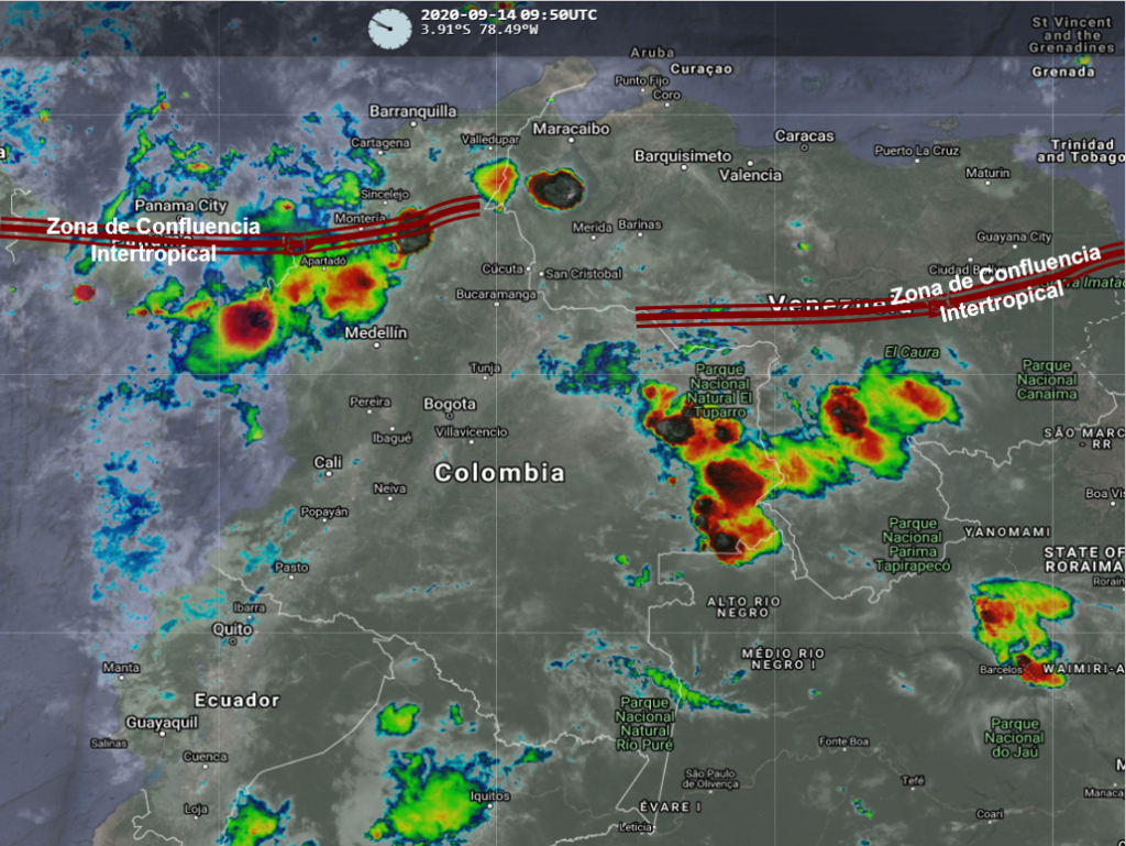 La Zona de Confluencia Intertropical y el ingreso de humedad desde el oriente del país, favorecen condiciones inestables en algunos sectores del norte, centro y oriente del territorio nacional, generando lluvias moderadas a fuertes en Chocó, Antioquia, Córdoba, Sucre,Bolívar, Vichada, Meta y Guainia. Lluvias ligeras y lloviznas en Cesar, Magdalena, Valle del Cauca, Cauca, Arauca, Eje Cafetero, Los Santanderes, Cundinamarca y Boyacá.