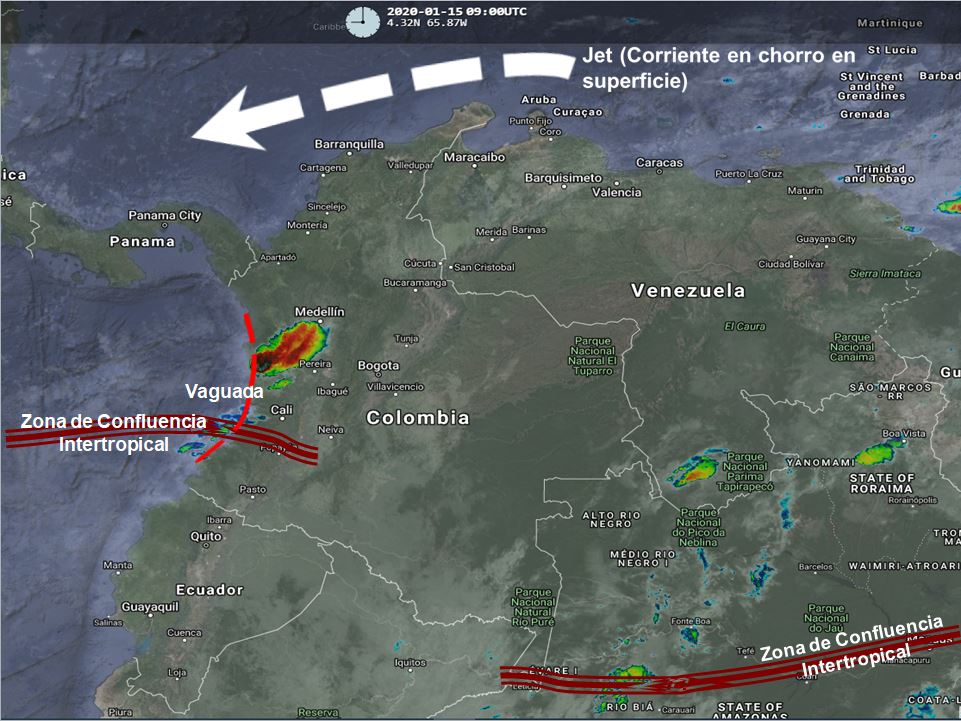 Condiciones de tiempo seco en gran parte del territorio nacional, la interacción de la Zona de Confluencia intertropical con una Vaguada al occidente del país podría generar algunas precipitaciones ocasionales y lluvias sectorizadas en sectores de los departamentos de Antioquia, Chocó, Valle del Cauca, Cauca, Nariño, Eje Cafetero, Cundinamarca, Boyacá y Santander especialmente en horas de la mañana. El Ingreso de humedad por el sur del país genera lluvias ligeras en sectores de Amazonas, Vaupés y Guainía. Vientos fuertes en la región Caribe debido a corrientes en chorro en superficie con intensidades entre 25 y 35 nudos (50 a 70 km/h).