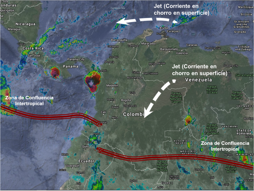 El Ramal Pacifico de La Zona de Confluencia Intertropical genera inestabilidad atmosférica en el occidente y suroccidente del pais, ocasionando lluvias ligeras a moderadas y algunas tormentas aisladas en el litoral pacífico y en sectores de los departamentos de Chocó, Antioquia, Risaralda, Valle, Cauca y Nariño. El ingreso de humedad favorece lluvias ligeras y sectorizadas en Amazonas, Vaupés y Guainía. Condiciones de tiempo seco y soleado en la región Caribe y el centro y norte de la región Andina.