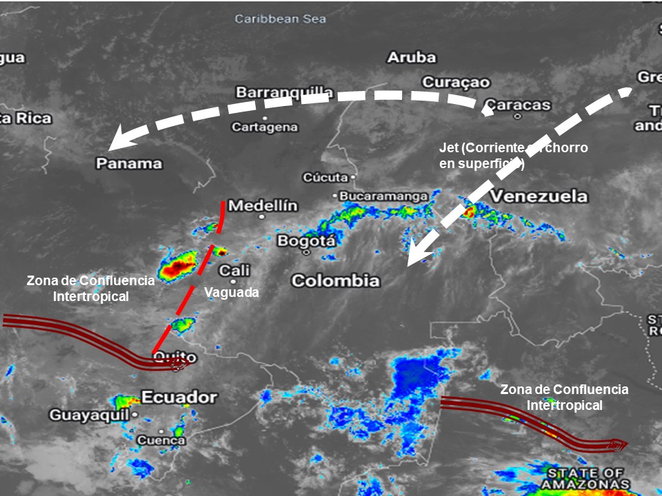 El ramal Pacífico de la Zona de Confluencia Intertropical en interacción con una Vaguada, un Sistema de Baja Presión, el ingreso de humedad por el Suroriente del país y procesos convectivos locales favorecen condiciones inestables que generan lluvias ligeras a moderadas y algunas tormentas en sectores de los departamentos de Chocó, Valle del Cauca, Cauca, Nariño y Amazonas. Precipitaciones ocasionales y lluvias de menor intensidad en los departamentos de Antioquia, Eje Cafetero, Santanderes y Tolima, Casanare, Boyacá, Cundinamarca.