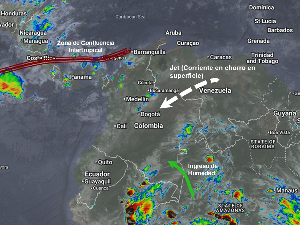 El ramal Pacífico de la Zona de Confluencia Intertropical, así como procesos convectivos locales favorecen condiciones inestables que generan lluvias ligeras a moderadas en sectores de los departamentos de Nariño, Valle del Cauca, Choco, Antioquia, Córdoba, Eje Cafetero, Santander, Guainía, Guaviare, Vaupés y Amazonas. Precipitaciones ocasionales y lluvias de menor intensidad en los departamentos de Guajira, Atlántico, Cesar, Magdalena, Sucre, Norte de Santander, Arauca, Casanare, Meta, Huila, Tolima, Santander, Cundinamarca, Boyacá, Caquetá y Putumayo.