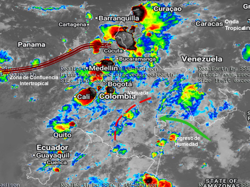 El ramal Pacífico de la Zona de Confluencia Intertropical en interacción con una Vaguada, el ingreso de humedad por el Oriente del país, así como procesos convectivos locales favorecen condiciones inestables, que generan lluvias ligeras a moderadas y algunas tormentas en sectores de los departamentos de Meta, Vichada, Guaviare, Vichada y Vaupés la Guajira, Atlántico, Magdalena, Cesar, Sucre, Córdoba, Bolívar, Los Santanderes, Antioquia, Chocó, Valle del Cauca, Cauca, Nariño, Boyacá, Cundinamarca,. Precipitaciones ocasionales y lluvias de menor intensidad en los departamentos de Tolima, Huila, Caquetá, Putumayo, Arauca, Casanare y Amazonas.