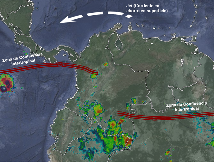El desplazamiento de la Zona de Confluencia Intertropical hacia el norte genera inestabilidad atmosférica en el occidente, centro y sur del país. Lluvias de variada intensidad y tormentas, especialmente en horas de la tarde y noche en sectores de los departamentos de Nariño, Cauca, Valle del Cauca, Risaralda, Caldas, Huila, Tolima, Quindío, Antioquia, Chocó, Cundinamarca, Boyacá y Santander. Eje Cafetero, Antioquia, Santander, Boyacá y Cundinamarca, Para la región Caribe predominio de tiempo seco en la mañana, en la tarde y noche, lluvias y tormentas aisladas en Córdoba, Sucre y el sur de los departamentos de Cesar, Magdalena y Bolívar. En la Amazonia lluvias y tormentas aisladas durante toda la jornada en Putumayo, Caquetá, Amazonas, Guaviare, Vaupés y Guainía. En la Orinoquia predominio de tiempo en la mañana y noche, en la tarde lluvias moderadas a fuertes en Vichada.