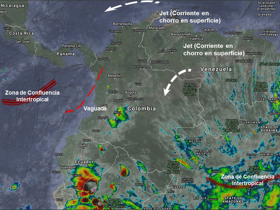 La interacción de la Zona de Confluencia Intertropical (ITCZ) con una Vaguada en el Pacifico y el ingreso de humedad desde el sur y oriente del país, generan lluvias de variada intensidad y algunas tormentas en sectores de los departamentos de Nariño, Cauca, Valle del Cauca, Chocó, Huila, Tolima, Antioquia, Eje Cafetero, Cundinamarca, Boyacá, Santander, Putumayo, Caquetá, Amazonas, Guainía, Guaviare y Vaupés.