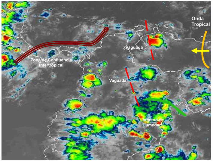 El ramal Pacífico de la Zona de Confluencia Intertropical en interacción con una Vaguada, el ingreso de humedad por el Oriente del país, así como procesos convectivos locales favorecen condiciones inestables, que generan lluvias ligeras a moderadas y algunas tormentas en sectores de los departamentos de Meta, Vichada, Guaviare, Vichada, Vaupés, Guajira, Atlántico, Magdalena, Cesar, Sucre, Córdoba, Bolívar, Santanderes, Antioquia, Eje Cafetero, Chocó, Valle del Cauca, Cauca, Nariño, Boyacá, Cundinamarca. Precipitaciones ocasionales y lluvias de menor intensidad en los departamentos de Tolima, Huila, Caquetá, Putumayo, Arauca, Casanare y Amazonas.