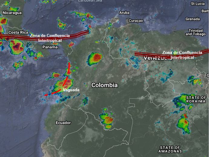 La interacción de la Zona de Confluencia Intertropical con una Vaguada y el ingreso de humedad desde el oriente del país, favorecen condiciones inestables en algunos sectores del norte, centro y occidente del territorio nacional, generando lluvias moderadas a fuertes en sectores de los departamentos de Chocó, Antioquia, Valle del Cauca, Cauca, Nariño, Vichada, Boyacá, Cundinamarca, Santanderes, Cesar, Bolívar, Sucre y Córdoba. Precipitaciones ocasionales y lluvias de menor intensidad en Atlántico, Magdalena, Arauca, Casanare, Meta, Guainía, Guaviare y Caquetá.