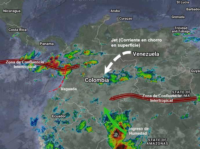 La interacción de la Zona de Confluencia Intertropical con una Vaguada en el Pacifico, el ingreso de humedad por el sur del país y el ingreso de un Jet corriente en chorro en superficie por la Orinoquía, generan inestabilidad atmosférica, incrementan la nubosidad ocasionando lluvias de variada intensidad en sectores de los departamentos de Antioquia, Eje Cafetero, Chocó, Valle del Cauca, Cauca, Nariño, Putumayo, Caquetá, Meta, Vichada, Guainía, Guaviare, Vaupés y Amazonas. Precipitaciones ocasionales y lluvias de menor intensidad en Cesar, Bolívar, Córdoba, Santanderes, Boyacá, Cundinamarca Tolima, Huila, Casanare y Arauca.