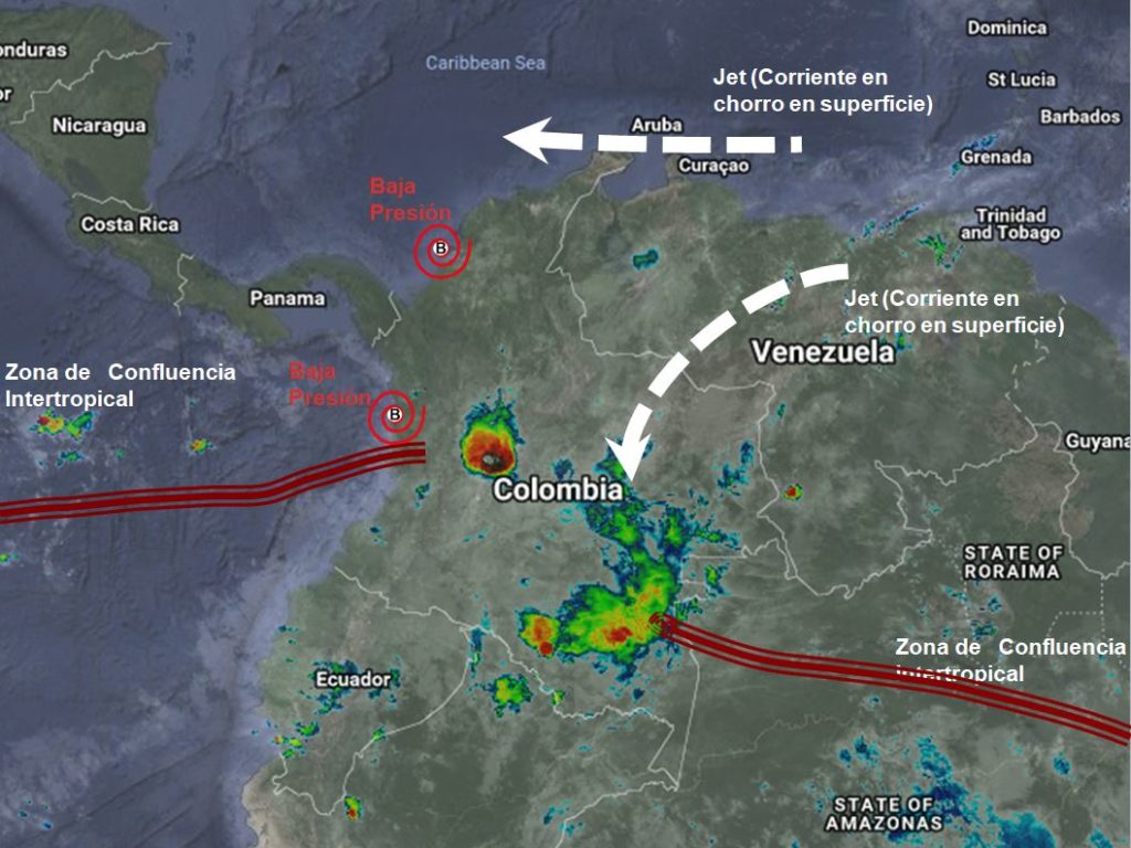 Condiciones de tiempo seco para la región Caribe, especialmente en horas de la mañana. Inestabilidad atmosférica en el centro, occidente, sur y suroriente del país, debido a la interacción de la Zona de Confluencia Intertropical (ZCIT) y unos sistemas de Baja Presión. Corrientes en Chorro en Superficie favorecen la ocurrencia de vientos fuertes en las regiones Caribe y Orinoquia.