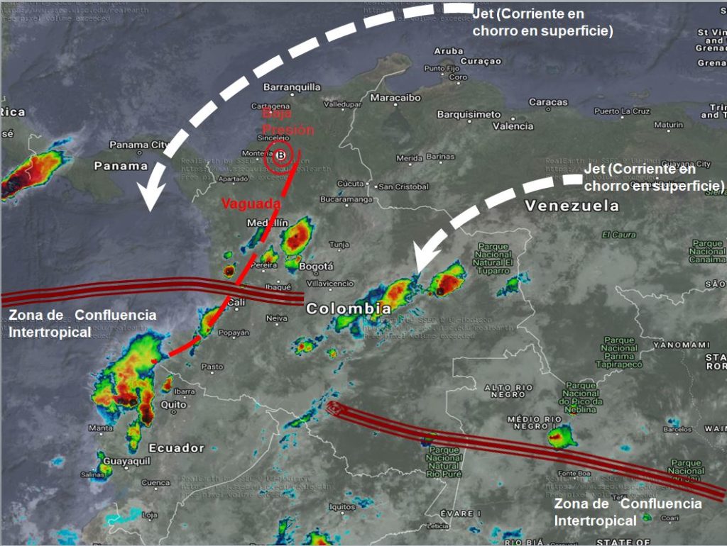 La interacción entre la Zona de Confluencia Intertropical (ZCIT) con una Vaguada y un Sistema de baja Presión, generan inestabilidad atmosférica en el occidente y sur occidente del país, favoreciendo el desarrollo de nubosidad y lluvias ligeras en sectores de los departamentos de Córdoba, Antioquia, Chocó, Valle del Cauca, Cauca, Nariño, Cundinamarca, Santander y Boyacá. El ramal Atlántico de la Zona de Confluencia Intertropical (ZCIT) y el ingreso de humedad por el oriente generan lluvias de moderadas a fuertes en sectores de Amazonas, Caquetá, Putumayo, Vichada, Guaviare y Meta. Predominio de tiempo seco en la región caribe con presencia de vientos entre 25 y 30 nudos (50 a 60 km/h) debido a una corriente en chorro.