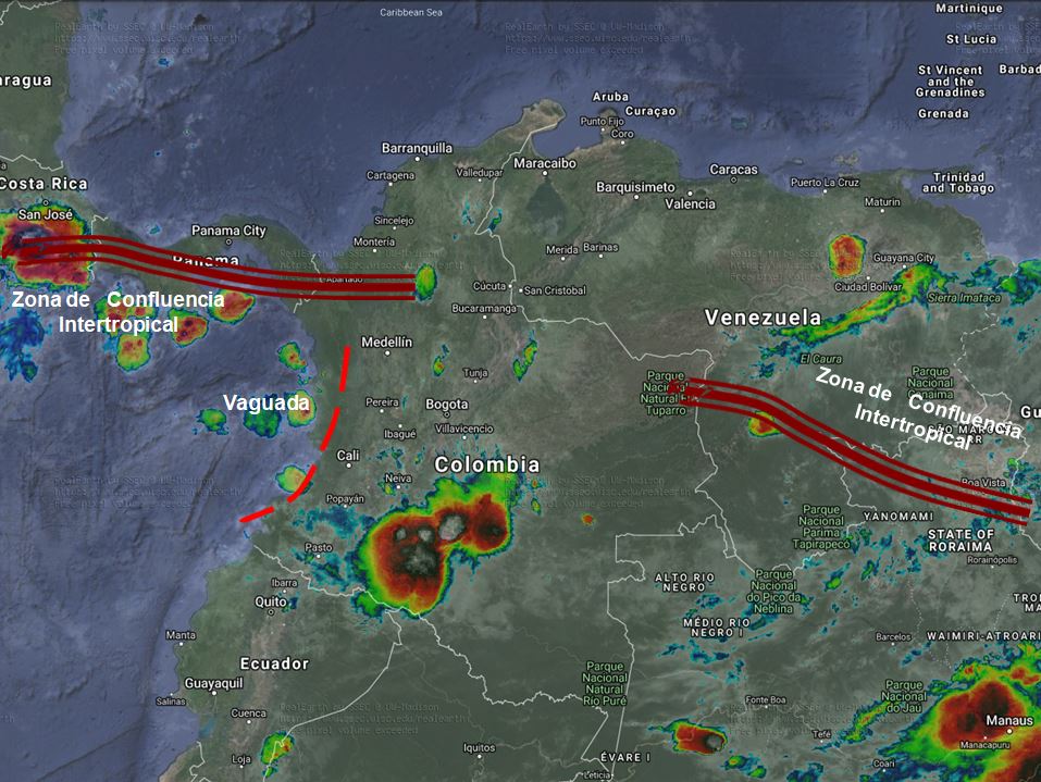 El ramal Pacifico de La Zona de Confluencia Intertropical en interacción con una Vaguada continúa generando inestabilidad atmosférica en el occidente y sur del país. Condiciones más secas en el norte y centro, especialmente en horas de la mañana y noche.