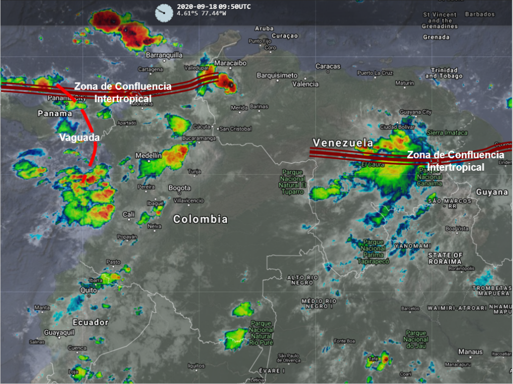 La interacción de la Zona de Confluencia Intertropical con una vaguada en el pacífico y el ingreso de humedad desde el oriente del país, favorecen condiciones instables en varias partes del territorio nacional, especialmente en horas de la tarde y noche, generando lluvias moderadas a fuertes en Nariño, Cauca, Valle, Chocó, Antioquia, Córdoba, Sucre, Cesar, Magdalena, Bolívar, Norte de Santander, Santander, Boyacá, Cundinamarca, Tolima, Huila y Eje cafetero. Lluvias de menor intensidad en Arauca, Vichada, Meta y Casanare.
