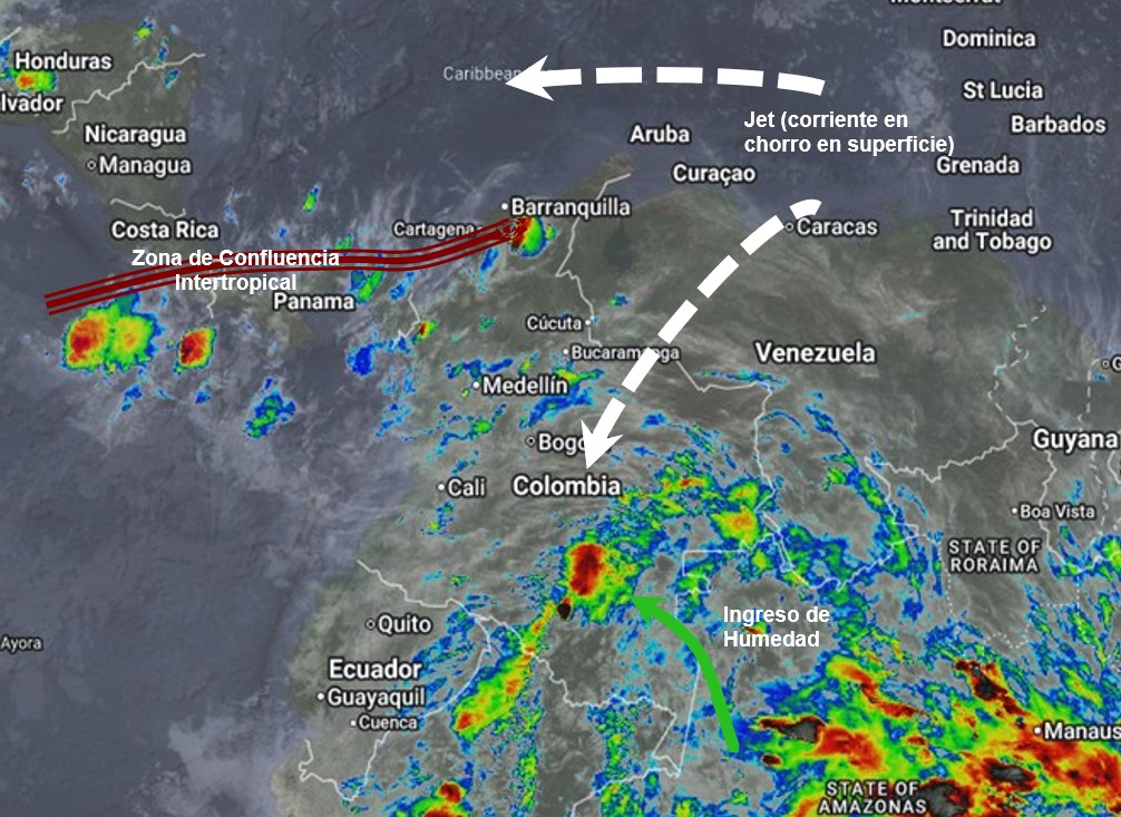 El ramal Pacífico de la Zona de Confluencia Intertropical en interacción con un Sistema de Baja Presión, así como procesos convectivos locales favorecen condiciones inestables, que generan lluvias ligeras a moderadas y algunas tormentas en sectores de los departamentos de Choco, Valle del Cauca, Cauca, Nariño, Huila, Tolima, Antioquia, Eje Cafetero, Santander, Boyacá, Cundinamarca, Guainía, Vaupés y Amazonas. Precipitaciones ocasionales y lluvias de menor intensidad en los departamentos de la Guajira, Cesar, Magdalena, Atlántico, Bolívar, Sucre, Córdoba, Norte de Santander, Arauca, Casanare, Meta, Guaviare, Caquetá y Putumayo.