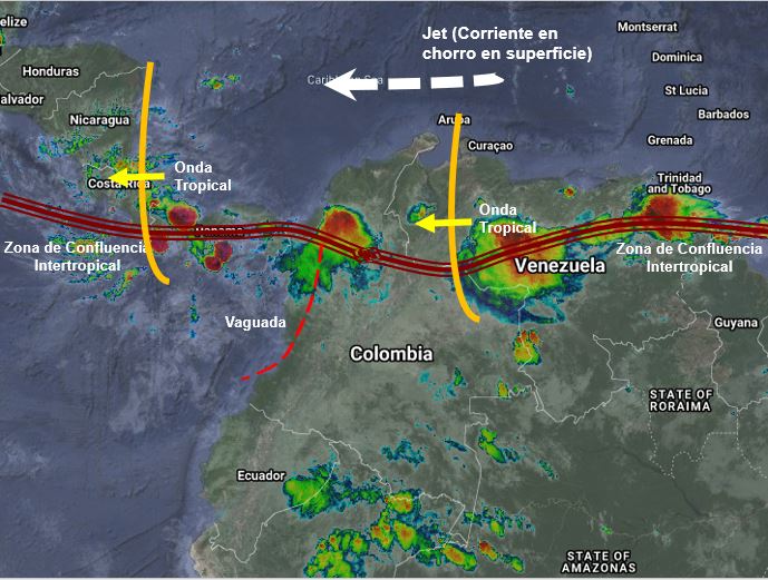El ramal pacifico de la Zona de Confluencia Intertropical en interacción con una vaguada, así como el paso de Ondas Tropicales del Este generan condiciones inestables en gran parte del territorio nacional. Lluvias ligeras a moderadas y algunas tormentas, especialmente en horas de la tarde en sectores de los departamentos de Amazonas, Caquetá, Vaupés, Guaviare, Guainía, Vichada, Arauca, Casanare, Meta, Santander, Boyacá, Antioquia, Chocó, Valle del Cauca, Tolima y el Eje Cafetero.