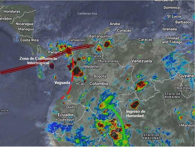 El ramal Pacífico de la Zona de Confluencia Intertropical en interacción con una Vaguada, un Sistema de Baja Presión, así como procesos convectivos locales favorecen condiciones inestables, que generan lluvias ligeras a moderadas y algunas tormentas en sectores de los departamentos de Cesar, Magdalena, Bolívar, Sucre, Córdoba, Santanderes, Antioquia, Boyacá, Cundinamarca, Eje Cafetero, Chocó, Valle del Cauca, Cauca, Nariño, Caquetá, Vaupés y Amazonas. Precipitaciones ocasionales y lluvias de menor intensidad en los departamentos de Guajira, Arauca, Casanare, Meta, Vichada, Guainía, Guaviare, Putumayo, Huila y Tolima.