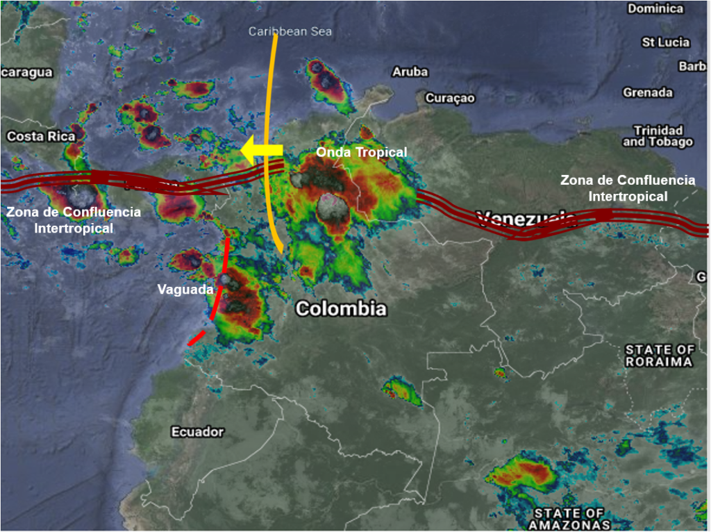 La interacción de la Zona de Confluencia Intertropical con una Vaguada en el Pacífico y el paso de una Onda Tropical del Este genera condiciones inestables en gran parte de las regiones Pacífica, Andina y Caribe. Lluvias de variada intensidad y tormentas en sectores de los departamentos de Boyacá, Santander, Norte de Santander, Cesar, Magdalena, La Guajira, Atlántico, Bolívar, Sucre, Córdoba, Antioquia, Chocó, Caldas, Risaralda, Quindío, Tolima, Valle del Cauca, Cauca y Nariño. Precipitaciones de menor intensidad en Cundinamarca.