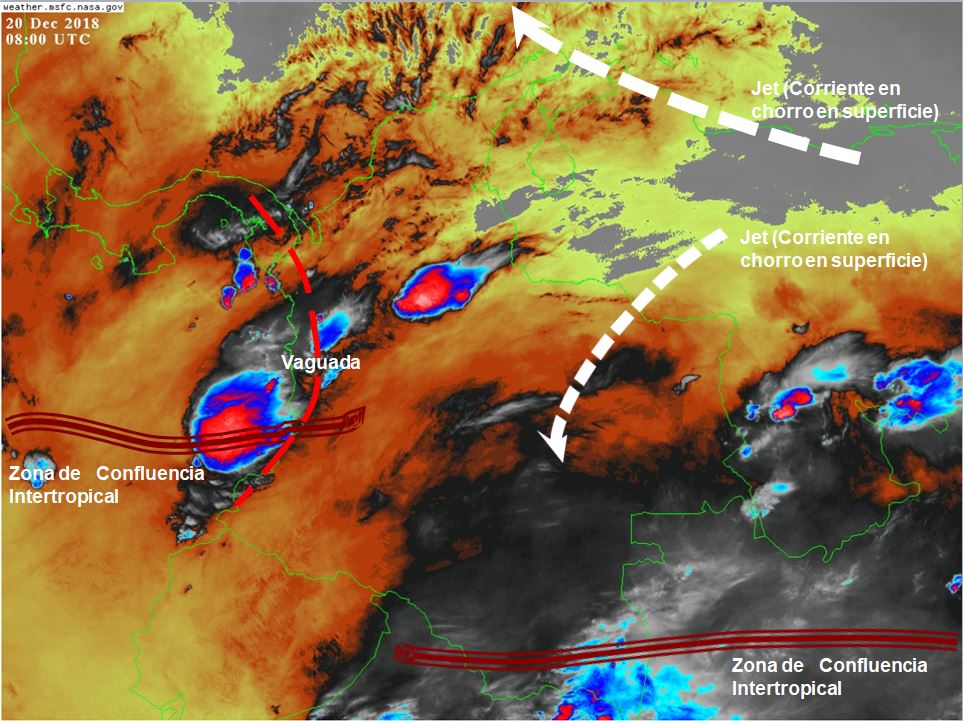 Predominio de tiempo seco en gran parte del territorio nacional en horas de la mañana. La Zona de Confluencia Intertropical (ZCIT) en interacción con una Vaguada, generan inestabilidad atmosférica en algunas regiones del país, favoreciendo el desarrollo de nubosidad y lloviznas en sectores de los departamentos de Chocó, Valle del Cauca, Cauca, Nariño, Caquetá, Amazonas, Vaupés, Guaviare y Guainía.