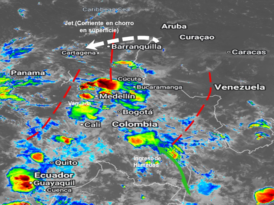 El ramal Pacífico de la Zona de Confluencia Intertropical, en interacción con tres vaguadas, un Sistema de Baja Presión, ingreso de humedad desde el suroriente del país y procesos convectivos locales favorecen condiciones inestables, que generan lluvias ligeras a moderadas y algunas tormentas en sectores de los departamentos de Cauca, Cesar, Chocó, Córdoba, Cundinamarca, Guainía, Guaviare, Huila, La Guajira, Magdalena, Meta, Nariño, Norte de Santander, Putumayo, Quindío, Risaralda, Santander, Sucre, Tolima, Valle del Cauca, Vaupés y Vichada, Amazonas, Antioquia, Atlántico, Bolívar, Boyacá, Caldas, Caquetá, ,. Precipitaciones ocasionales y lluvias de menor intensidad en los departamentos de Casanare, Arauca.