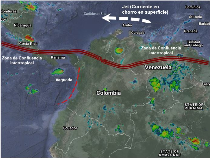 El ramal pacifico de la Zona de Confluencia Intertropical en interacción con una vaguada, genera algunas precipitaciones ocasionales y lluvias aisladas en sectores de Chocó, Antioquia, Valle del Cauca, Cauca y Nariño, especialmente en horas de la tarde. Condiciones de tiempo seco en las regiones Caribe y Andina. En la Orinoquia lluvias sectorizadas en Vichada, Precipitaciones ocasionales en Meta, Casanare y Arauca. En la Amazonia cielo mayormente nublado con lluvias moderadas a fuertes y algunas tormentas en Putumayo, Caquetá y Amazonas., Precipitaciones de menor intensidad en Vaupés, Guaviare y Guainía. Vientos fuertes en la zona marítima del norte de Colombia con intensidades de hasta 30 nudos (54 Km/h).
