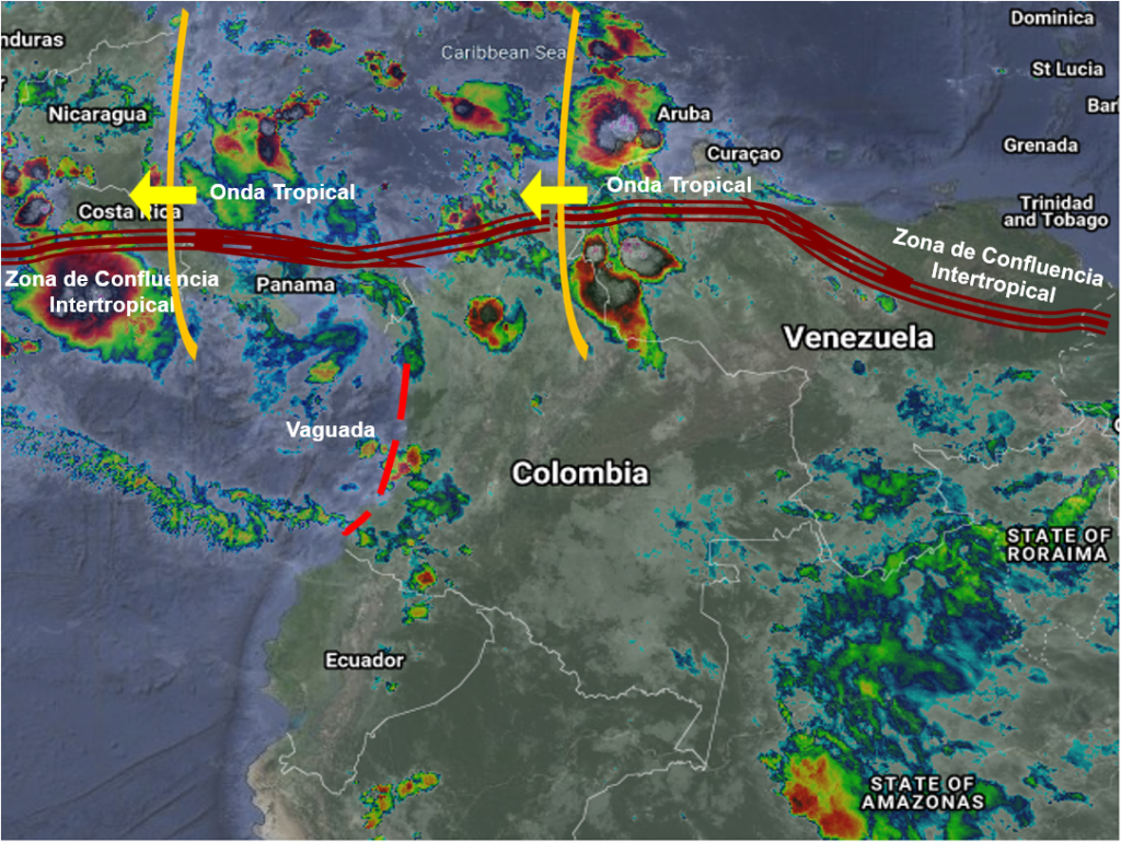 El Continuo paso de Ondas Tropicales del Este y su interacción con la Zona de Confluencia Intertropical genera condiciones inestables en el centro, occidente y norte del país. Lluvias de variada intensidad y tormentas en La Guajira, Cesar, Magdalena, Atlántico, Bolívar, Sucre, Córdoba, Antioquia, Chocó, Eje Cafetero, Valle del Cauca, Cauca, Nariño, Tolima, Boyacá, Santander, Norte de Santander y Arauca. Precipitaciones de menor intensidad en Cundinamarca, Meta, Vichada Guainía, Vaupés, Caquetá y Amazonas.