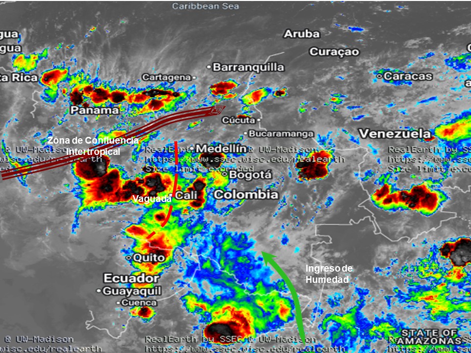 El ramal Pacífico de la Zona de Confluencia Intertropical en interacción con una Vaguada, un Sistema de Baja Presión, así como procesos convectivos locales favorecen condiciones inestables, que generan lluvias ligeras a moderadas y algunas tormentas en sectores de los departamentos de, Valle del Cauca, Cauca, Nariño, Caquetá, Vaupés y Amazonas, Cesar, Magdalena, Bolívar, Sucre, Córdoba, Santanderes, Antioquia, Boyacá, Cundinamarca, Eje Cafetero, Chocó. Precipitaciones ocasionales y lluvias de menor intensidad en los departamentos de Guajira, Arauca, Casanare, Meta, Vichada, Guainía, Guaviare, Putumayo Huila y Tolima.