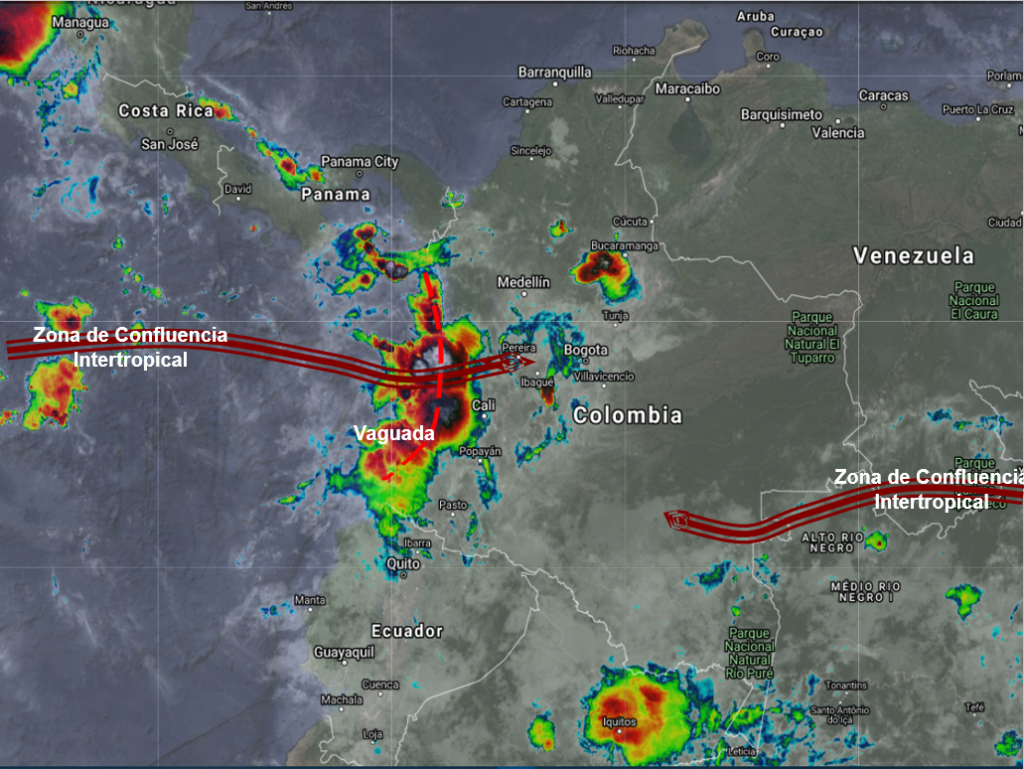 El ramal Pacífico de la Zona de Confluencia Intertropical en interacción con una Vaguada, genera condiciones inestables que afectan las regiones Pacífica, Andina y sur de la región Caribe. Se prevén lluvias moderadas a fuertes y algunas tormentas en sectores de los departamentos de Chocó, Valle, Cauca, Nariño, Antioquia, Córdoba, Norte de Santander, Santander, Cundinamarca, Boyacá y Tolima, lluvias sectorizadas en el Eje Cafetero, Bolívar, Magdalena y Cesar. El ingreso de humedad por el oriente del país favorece la presencia de lluvias ligeras en Guainía, Vaupés, Caquetá, Putumayo y Amazonas.