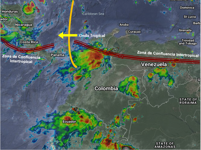 El paso de una Onda Tropical del Este generando inestabilidad atmosférica en gran parte de la región Caribe y el centro y norte de las regiones Pacífica y Andina. Lluvias moderadas a fuertes y tormentas se prevén en sectores de los departamentos de La Guajira, Cesar, Magdalena, Atlántico, Bolívar, Sucre, Córdoba, Chocó, Antioquia, Eje Cafetero, Tolima, Cundinamarca, Boyacá, Santander y Norte de Santander, especialmente en horas de la tarde y noche. Precipitaciones de menor intensidad en Arauca, Casanare, Meta, Vichada, Guainía, Guaviare, Vaupés, Amazonas, Caquetá y Putumayo.