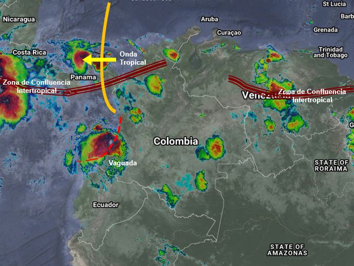 La interacción de la Zona de Confluencia Intertropical con una Vaguada en el Pacífico y el paso de una Onda Tropical del Este, continúan generando inestabilidad atmosférica en algunos sectores del Oriente, Norte y Occidente del país. Para hoy se prevén lluvias ligeras a moderadas en los departamentos de Córdoba, Sucre, Bolívar, Magdalena, Cesar, La Guajira, Antioquia, Santanderes, Chocó, Valle del Cauca, Cauca, Nariño, Guainía, Vichada, Arauca, Meta y Casanare. Precipitaciones ocasionales y lluvias de menor intensidad en el Eje Cafetero, Tolima, Huila, Cundinamarca, Boyacá, Guainía, Guaviare, Vaupés, Amazonas, Caquetá y Putumayo.