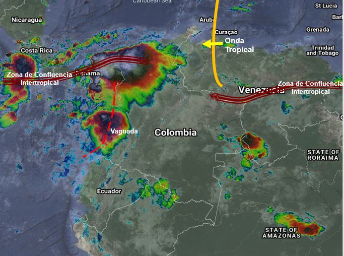 El ramal Pacifico de la Zona de Confluencia Intertropical en interacción con una vaguada y el paso de Ondas Tropicales del Este, generan nubosidad convectiva que favorece la probabilidad de lluvias de variada intensidad, en sectores de los departamentos de Cesar, Magdalena, Bolívar, Sucre, Córdoba, Antioquia, Chocó, Valle del Cauca, Cauca, Nariño, Putumayo, Caquetá, Huila, Meta, Casanare, Arauca, Vichada, Guainía, Guaviare, Vaupés y Amazonas. Precipitaciones ocasionales y lluvias de menor intensidad en Tolima, Eje Cafetero, Cundinamarca, Boyacá y Santanderes.
