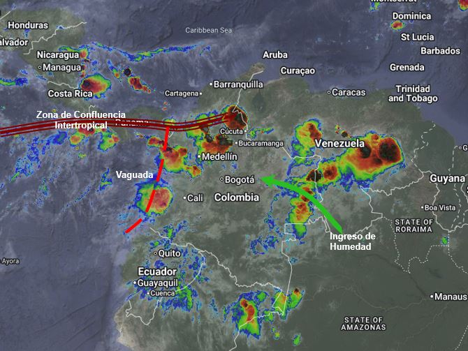 El ramal Pacífico de la Zona de Confluencia Intertropical en interacción con una Vaguada, el ingreso de humedad por el Oriente del país, así como como procesos convectivos locales favorecen condiciones inestables, que generan lluvias ligeras a moderadas y algunas tormentas en sectores de los departamentos de Cesar, Bolívar, Sucre, Córdoba, Antioquia, Chocó, Valle del Cauca, Cauca, Nariño, Eje Cafetero, Cundinamarca, Boyacá, Santanderes, Arauca, Casanare, Meta, Guaviare, Guainía, Vaupés, Caquetá y Amazonas. Precipitaciones ocasionales y lluvias de menor intensidad en los departamentos Atlántico, Magdalena, Guajira, Tolima, Huila, Putumayo y Vichada.