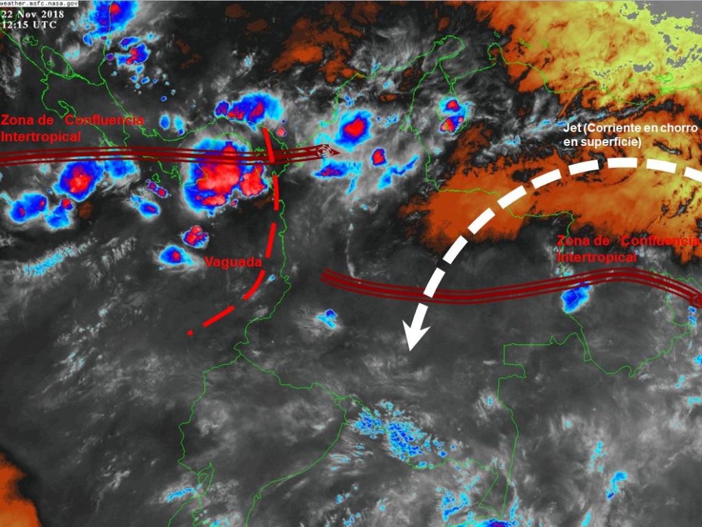La Zona de Confluencia Intertropical (ZCIT) en interacción con una Vaguada, generan inestabilidad atmosférica en algunas regiones del territorio nacional, favoreciendo el desarrollo de nubosidad y precipitaciones de variada intensidad en sectores de los departamentos de Cesar, Bolívar, Magdalena, Sucre, Córdoba, Norte de Santander, Huila, Cauca, Caquetá, Putumayo, Amazonas, Vaupés, Guaviare, Meta, Vichada, Guainía, Tolima, Antioquia y Caldas.