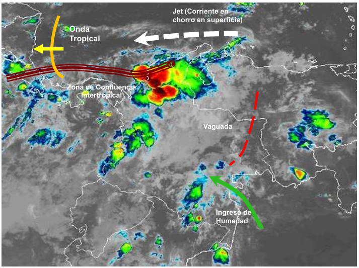 El ramal Pacífico de la Zona de Confluencia Intertropical en interacción con una Vaguada, un Sistema de Baja Presión, el ingreso de humedad por el Oriente del país, así como procesos convectivos locales, favorecen condiciones inestables que generan lluvias sectorizadas a fuertes y algunas tormentas en sectores de los departamentos de Cesar, Guajira, Magdalena, Atlántico, Bolívar, Sucre, Córdoba, Antioquia, Santanderes, Chocó, Valle del Cauca, Cauca, Nariño, Tolima, Arauca Casanare, Vichada, Guainía, Guaviare, Vaupés, Caquetá y Amazonas. Precipitaciones ocasionales y lluvias de menor intensidad en los departamentos de Boyacá, Cundinamarca, Eje Cafetero, Huila, Putumayo y Meta.