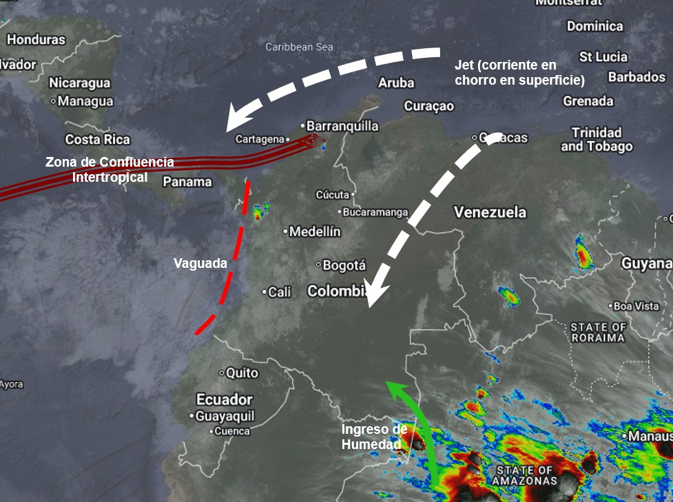 El ramal Pacífico de la Zona de Confluencia Intertropical en interacción con una Vaguada, un Sistema de Baja Presión, así como procesos convectivos locales favorecen condiciones inestables, que generan lluvias ligeras a moderadas y algunas tormentas en sectores de los departamentos de Amazonas Guainía, Chocó, Valle del Cauca, Cauca, Nariño, Eje Cafetero, Boyacá, Huila y Tolima. Precipitaciones ocasionales y lluvias de menor intensidad en los departamentos de Cesar, Magdalena, Atlántico, Bolívar, Sucre, Santanderes, Cundinamarca, Antioquia, Caquetá, Guaviare, Arauca, Vaupés, y Putumayo.
