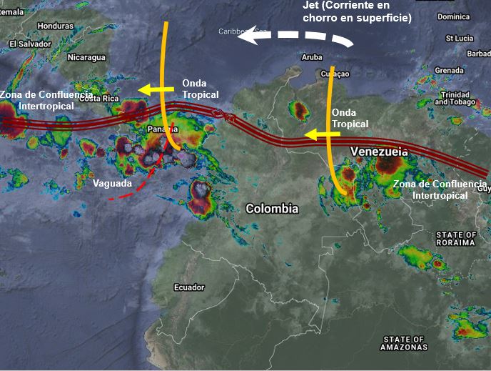 El ramal pacifico de la Zona de Confluencia Intertropical en interacción con una vaguada y el paso de Ondas tropicales del este, favorecen condiciones inestables en gran parte del territorio nacional, lluvias fuertes y tormentas a lo largo del litoral Pacifico y en sectores de los departamentos de Chocó, Antioquia y el Valle del Cauca. Lluvias ligeras a moderadas en Cauca, Nariño, Putumayo, Caquetá, Huila, Guaviare, Vaupés, Guainía, Vichada, Arauca, Casanare, Meta, Cundinamarca, Boyacá, Los Santanderes, Cesar, Magdalena, Bolívar y Córdoba. Precipitaciones de menor intensidad en Amazonas. Se encuentra activa corriente el chorro en el mar caribe con vientos entre 20 y 30 nudos (36 a 54 km/h).