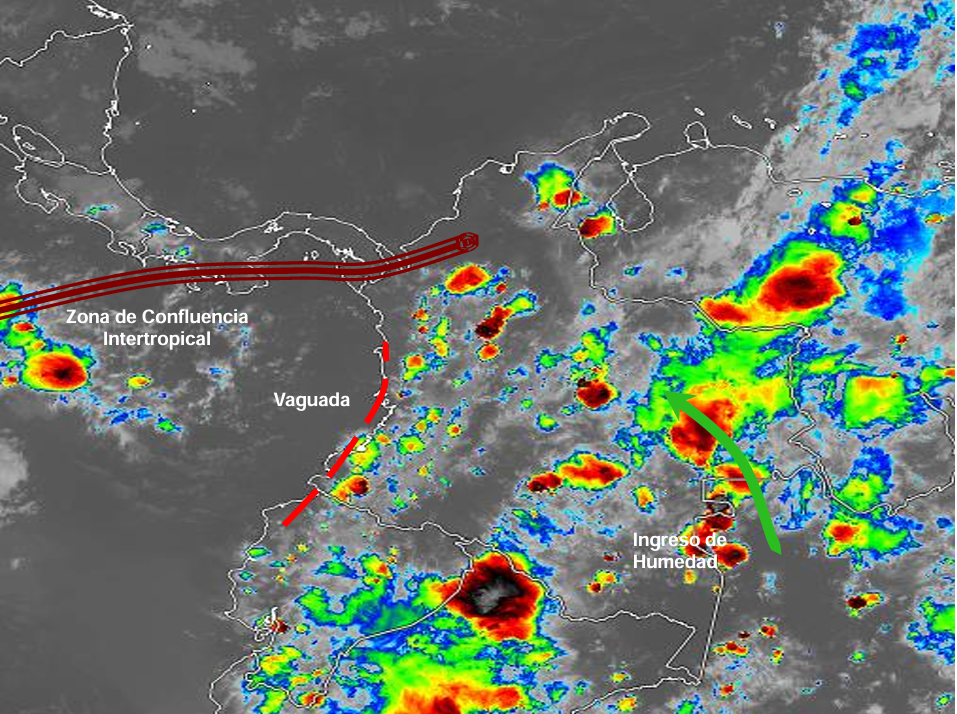 El ramal Pacífico de la Zona de Confluencia Intertropical en interacción con una Vaguada, un Sistema de Baja Presión, el ingreso de humedad por el Oriente del país, así como procesos convectivos locales favorecen condiciones inestables que generan lluvias ligeras a moderadas y algunas tormentas en sectores de los departamentos de Cesar, Magdalena, Bolívar, Sucre, Córdoba, Antioquia, Chocó, Valle del Cauca, Cauca, Nariño, Huila, Tolima, Eje Cafetero, Cundinamarca, Boyacá, Santanderes, Arauca, Casanare, Vichada, Guaviare, Meta, Guainía, Vaupés y Amazonas. Precipitaciones ocasionales y lluvias de menor intensidad en sectores de los departamentos de Atlántico, Guajira, Caquetá y Putumayo.