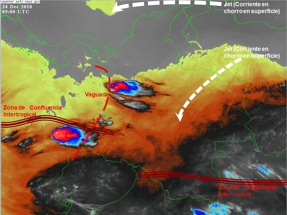 La Zona de Confluencia Intertropical (ZCIT) en interacción con una Vaguada, generan inestabilidad atmosférica en el occidente y suroccidente del país. Condiciones secas en la región Caribe y vientos fuertes debido a corrientes en chorro en superficie.