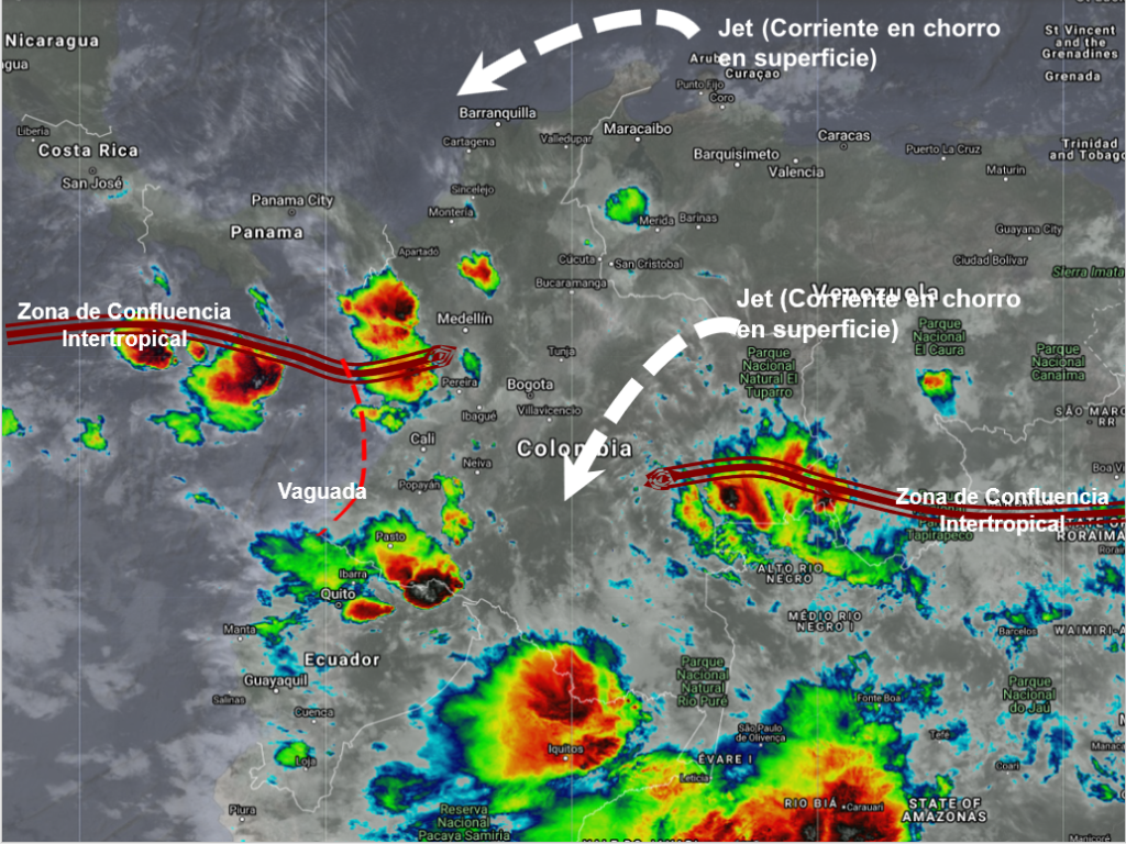 La interacción de la Zona de Confluencia Intertropical con una Vaguada en el Pacifico genera inestabilidad atmosférica, aumentando la nubosidad y produciendo lluvias ligeras a moderadas, algunas acompañadas de actividad eléctrica, en sectores de los departamentos de Chocó, Valle del Cauca, Cauca y Nariño especialmente en horas de la tarde, precipitaciones ocasionales y lluvias sectorizadas en Antioquia, Eje Cafetero, Boyacá, Cundinamarca, Huila, Tolima y Santanderes. El ingreso de humedad por el suroriente del país favorece la presencia de lluvias de variada intensidad en los departamentos de Guainía, Vaupés, Amazonas y Guaviare. Corrientes en chorro en superficie sobre el Mar Caribe y la Orinoquia favorece condiciones de tiempo seco, en los departamentos de La Guajira, Magdalena, Cesar, Atlántico, Bolívar, Sucre, Arauca, Vichada, Casanare y Meta.