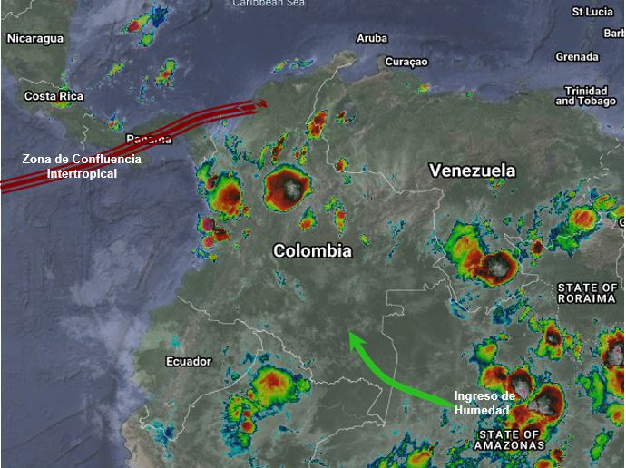 El ingreso de humedad por el sur y oriente del país genera inestabilidad atmosférica en varias partes del territorio nacional, incrementando la nubosidad con probabilidad de lluvias de variada intensidad, algunas acompañadas de actividad eléctrica, en sectores de los departamentos de Caquetá, Guaviare, Vaupés, Guainía, Vichada Meta, Antioquia, Chocó, Cauca, Valle del Cauca y Nariño. Precipitaciones ocasionales y lluvias de menor intensidad en Amazonas, Putumayo, Tolima, Huila, Eje Cafetero, Cundinamarca, Boyacá, Arauca, Casanare, Santanderes, Cesar, Magdalena, Guajira, Bolívar, Atlántico, Sucre y Córdoba.