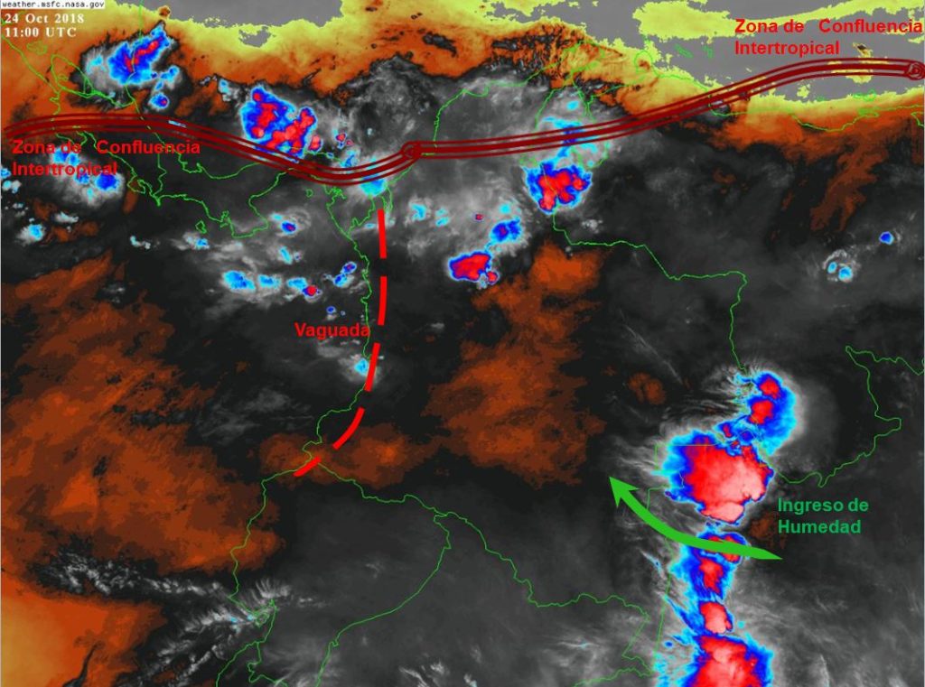 La Zona de Confluencia Intertropical (ZCIT) en interacción con una Vaguada y el ingreso de humedad por el suroriente del país, generan inestabilidad atmosférica en algunas regiones del territorio nacional, favoreciendo el desarrollo de nubosidad y precipitaciones de variada intensidad en sectores de los departamentos de Norte de Santander, Córdoba, Bolívar, Antioquia, Chocó, Valle del Cauca, Amazonas, Guainía, Vaupés, Santander, Boyacá, Caldas, Tolima y Cundinamarca.